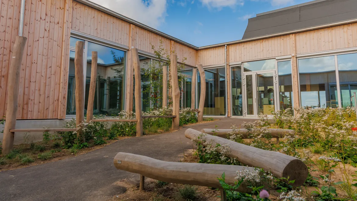 Desuden har vi en dejlig legeplads og lige uden for hegnet har vi den skønne skov, som vi bruger flittigt.